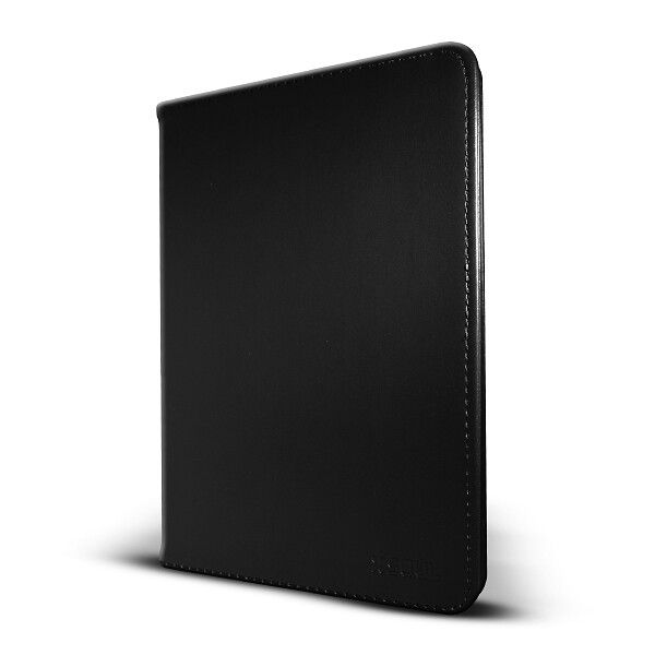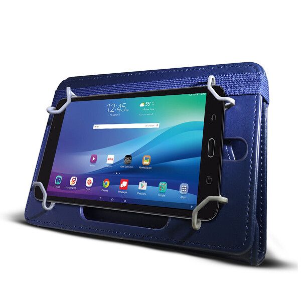 Compuesto por cuerina, solapa giratoria para buscar la mejor posicion de la tablet. El dispositivo se calza por medio de ganchitos con elastico en cada uno de los extremos.
