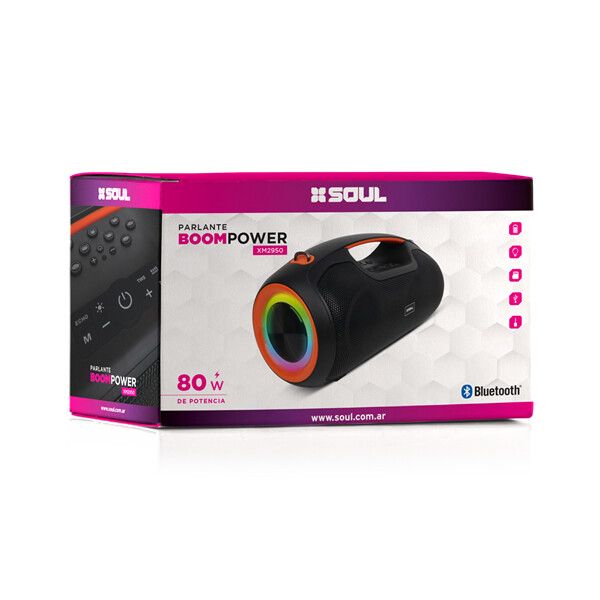 El SOUL XM2950 BOOM POWER es un parlante portátil de alto desempeño, pensado para quienes buscan máxima potencia y sonido envolvente. Con 80W de potencia, ofrece un audio fuerte y definido, ideal para fiestas, eventos y uso en exteriores.