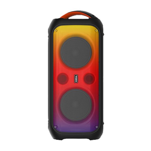 Con 50 watts de potencia, ajuste de graves y agudos, micrófono inalámbrico incluido y control remoto. Portabilidad total gracias a su correa de transporte.