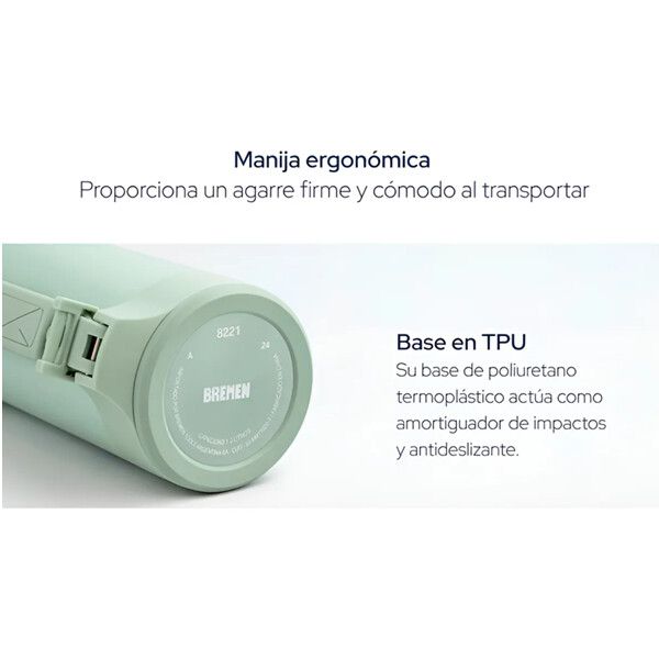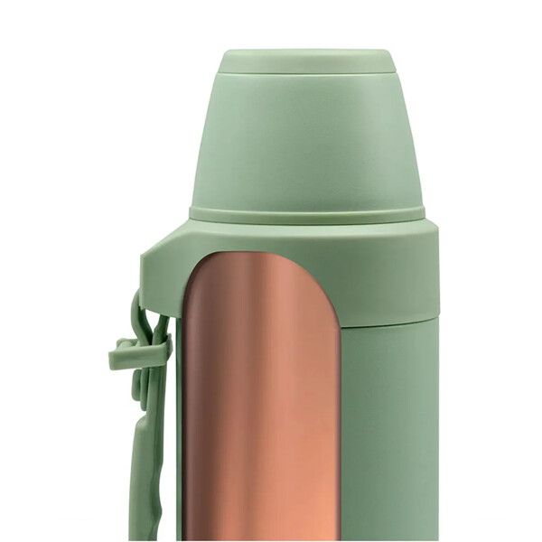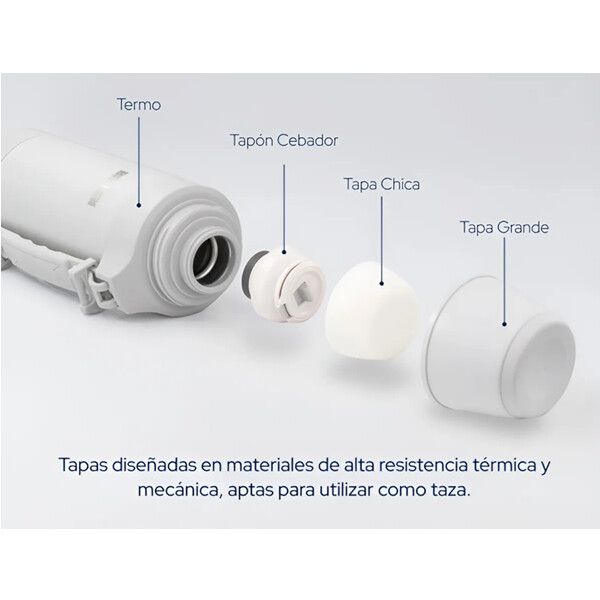 El tapón cebador 360° con apertura lateral permite servir de forma ágil y sin derrames, mientras que la tapa exterior e interior, ambas de gran resistencia mecánica y térmica, pueden utilizarse como taza en cualquier lugar. Además, cuenta con una manija ergonómica que facilita el transporte, incluso cuando el termo está lleno.